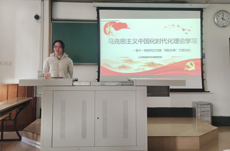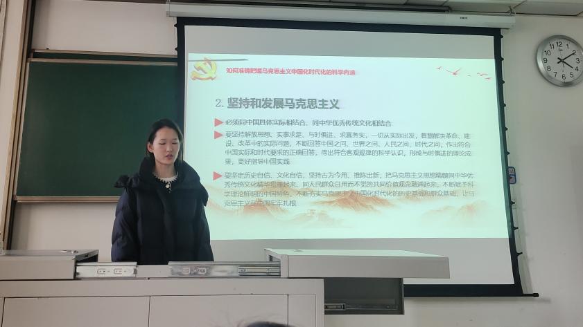 活动伊始,周孜涵同志带领大家学习了马克思主义中国化时代化提出的背景、原因等相关内容,并以“三次飞跃”与“两个结合”为重点,介绍了中国共产党在不同的历史时期,如何将马克思主义基本原理与中国具体实际相结合,形成具有中国特色的革命、建设和改革理论。通过详细解读马克思主义中国化时代化的内涵,支部成员明白了只有坚持理论创新,才能够保持马克思主义的真理力量和实践伟力,只有中国化时代化的马克思主义才能解决中国问题,指导实践创新。