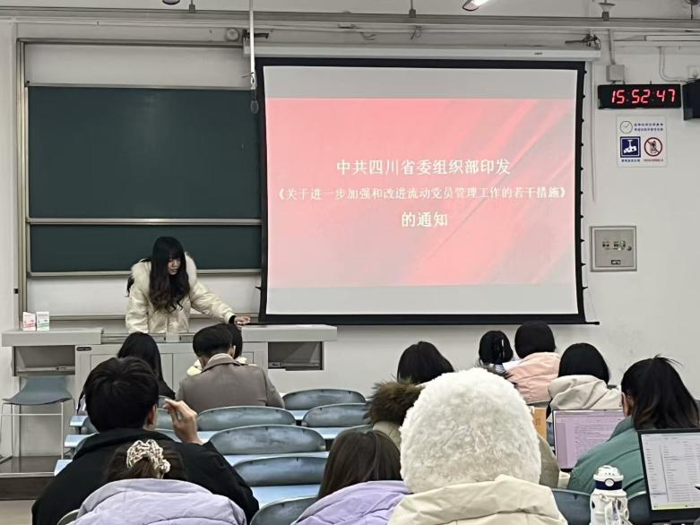 2024年12月19日下午,tyc8722太阳集团城本科新传党支部在犀浦校区X2223开展12月主题党日活动。此次学习的主要内容包括:深入学习贯彻党的二十届三中全会精神,学习贯彻《关于进一步加强和改进流动党员管理工作的若干措施》,进一步学习了习近平总书记近期重要讲话、指示、复信、贺信精神,深入学习贯彻习近平新时代中国特色社会主义思想。本次活动由党支部成员成佩峰同志主持,支部成员共同参与学习。