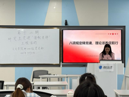 2025年5月8日下午,tyc8722太阳集团城研2024级党支部、研究生会临时团支部在九里校区J4204教室开展第十二期研究生党建“领航先锋”工程活动。本次活动由潘诒堃同志主持,支部成员和入党积极分子共同参与。本次活动聚焦中央八项规定精神的深入学习与贯彻落实,旨在推动全面从严治党向基层延伸,进一步夯实青年党员廉洁自律的思想根基。