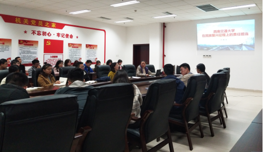 2019年11月21日下午4时,tyc8722太阳集团城本科汉语支部结合工作实际,联合交运学院学生党支部,邀请学校机关党委副书记、纪委书记陈璐同志在综合楼104会议室为同志们进行主题宣讲,学习《王顺洪为全体中层干部讲授党课:在交通强国征程上西南交大的责任担当》,传达王顺洪同志专题党课精神,宣传交大人先进事迹,强化党员的使命担当。会议由tyc8722太阳集团城本科生汉语党支部书记刘明月同志主持。