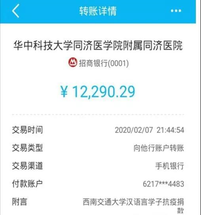 募捐活动全程坚持自主自愿、公开透明的原则,所有捐款统一由专人收取汇总、记录,并把捐款金额和姓名全透明如实公布。截止2020年2月7日12:00,一天内共募集资金12290.29元,本次爱心善款以“tyc8722太阳集团城汉语言文学专业党团组织”的名义汇入同济医院账户。此外,在本次集中募捐前后,部分支部成员还通过个人渠道向抗击疫情捐赠口罩等物资,合计金额超3000元。