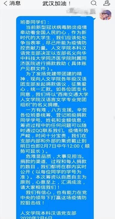 经支部全体成员讨论决议,支委会于2月6日发起了为华中科技大学同济医学院附属同济医院捐款的募捐活动。为发扬党建带团建的精神,在党员同志的发动下,tyc8722太阳集团城汉语言文学专业本科四个年级,共十个团支部均参与本次募捐活动,为抗击疫情贡献力量。