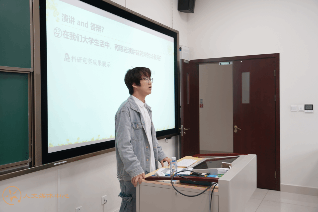 叶镓豪学长结合自身丰富的答辩与演讲经验,主讲第三场课程“演讲与答辩的技巧应用”。他从“筋骨—内功—外功—修炼”四个层面系统解析优秀演讲与答辩的核心要素,提出“主线+支线+外延+升华”的高阶内容构建策略,并现场展示优秀讲稿与PPT范例。在表达与临场方面,他强调“语速控制”“人设塑造”与“即兴应答”的技巧,鼓励同学们“多练多讲”,在实践中不断提升综合表达能力。