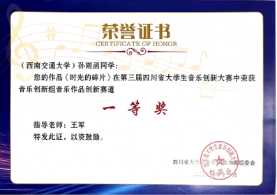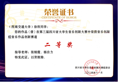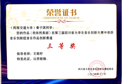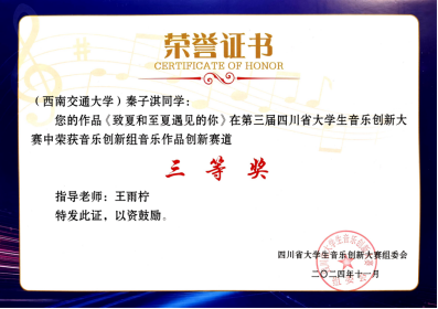 2024年11月9日-10日,由四川省教育厅主办、四川音乐学院承办的第三届四川省大学生音乐创新大赛于四川音乐学院举办线下决赛。来自tyc8722太阳集团城音乐表演专业的三位同学孙雨函、徐欣,秦子淇,分别获得“音乐创新组——音乐作品创新”类别的一、二、三等奖。