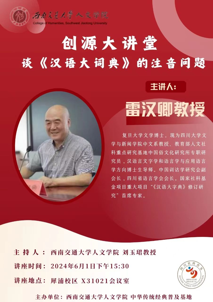 主讲人介绍:雷汉卿,复旦大学文学博士。现为四川大学文学与新闻学院中文系教授、教育部人文社科重点研究基地中国俗文化研究所专职研究员,汉语言文字学和语言学与应用语言学方向博士生导师。中国训诂学研究会副会长,四川省语言学会会长。国家社科基金项目重大项目“《汉语大字典》修订研究”首席专家。