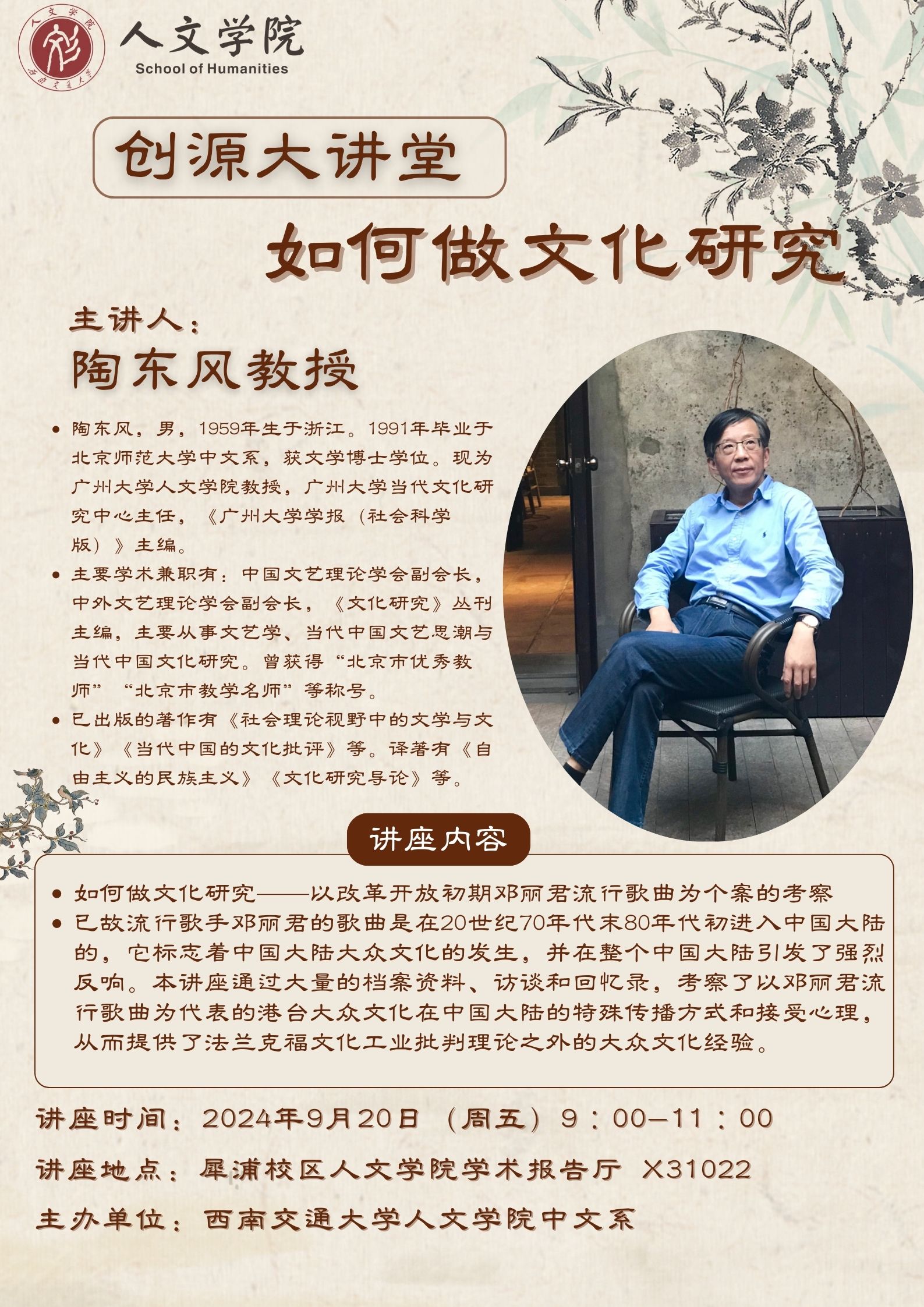 主讲人介绍:陶东风,男,1959年生于浙江。1991年毕业于北京师范大学中文系,获文学博士学位。现为广州大学tyc8722太阳集团城教授,广州大学当代文化研究中心主任,《广州大学学报(社会科学版)》主编。主要学术兼职有:中国文艺理论学会副会长,中外文艺理论学会副会长,《文化研究》丛刊主编,主要从事文艺学、当代中国文艺思潮与当代中国文化研究。曾获得“北京市优秀教师”“北京市教学名师”等称号。已出版的著作有《社会理论视野中的文学与文化》《当代中国的文化批评》《文化研究:西方与中国》《当代中国文艺思潮与文化热点》《文学理论的公共性:重建政治批评》《当代中国文艺学研究》《当代中国的文化研究》《颓败•毁灭•救赎》《当代中国的文艺学研究(1949-2019)》《当代中国大众文化的价值观研究》等。译著有《自由主义的民族主义》《文化与权力:布尔迪厄的社会学》《文化研究导论》等。