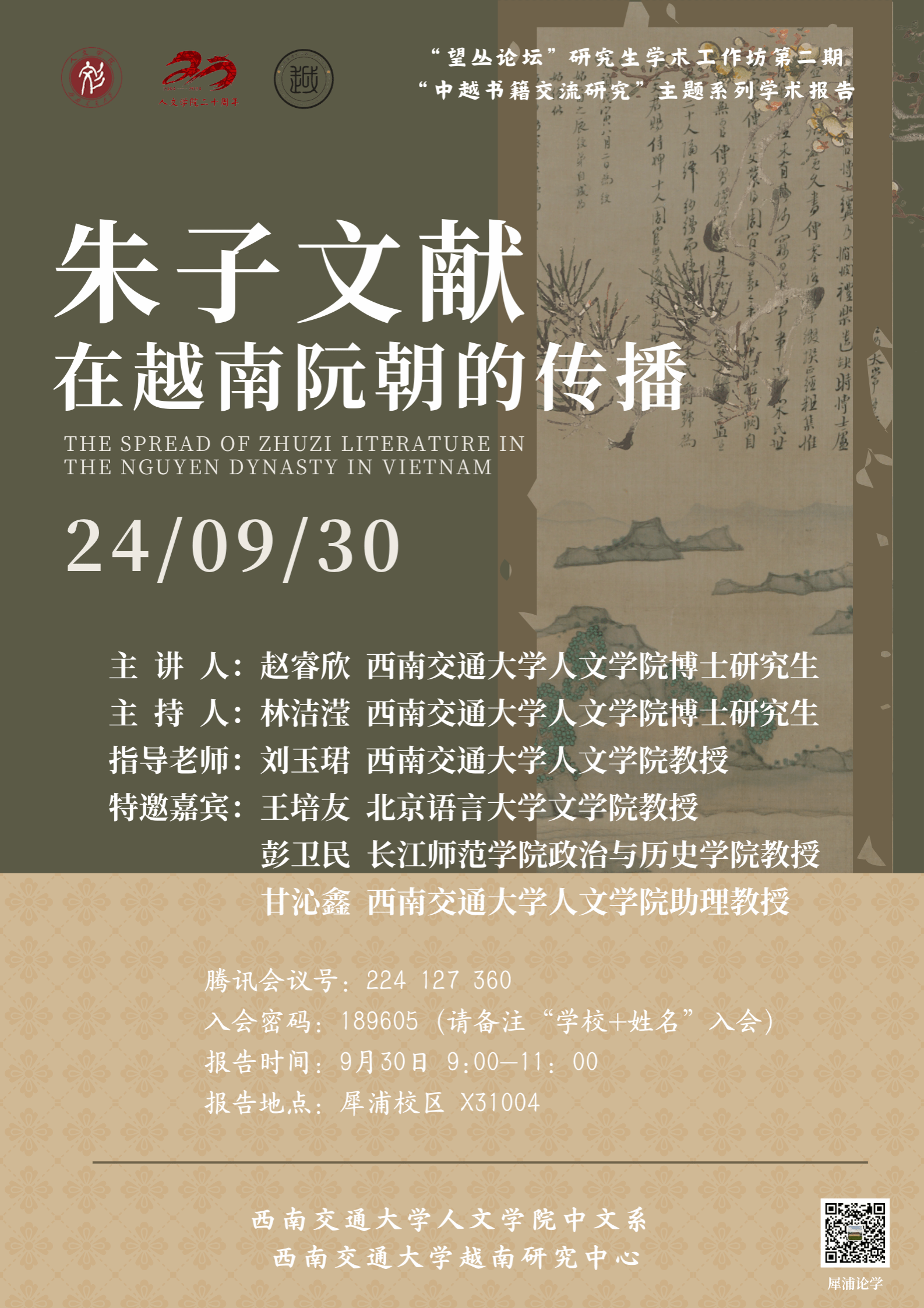 “望丛论坛”研究生学术工作坊第二期,依托tyc8722太阳集团城刘玉珺教授所主持的国家社会科学基金重大项目“中越书籍交流研究(多卷本)”,由课题组2022级博士研究生赵睿欣进行主题学术报告。