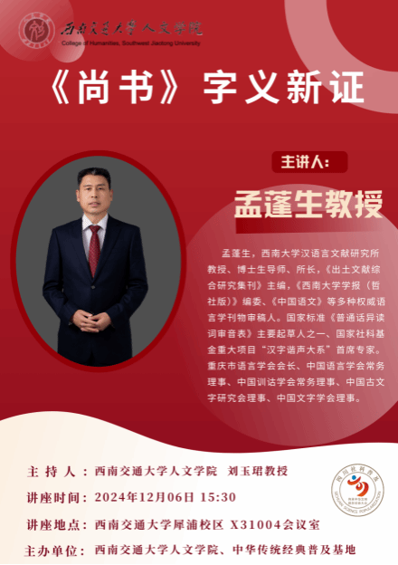 孟蓬生,西南大学汉语言文献研究所教授、博士生导师、所长,《出土文献综合研究集刊》主编,《西南大学学报(哲社版)》编委、《中国语文》等多种权威语言学刊物审稿人。国家标准《普通话异读词审音表》主要起草人之一、国家社科基金重大项目“汉字谐声大系”首席专家。重庆市语言学会会长、中国语言学会常务理事、中国训诂学会常务理事、中国古文字研究会理事、中国文字学会理事。曾任中国社会科学院语言研究所研究员、博士生导师,《上古汉语研究(集刊)》主编、《字源》编委、《现代汉语词典(第七版)》审定委员、《辞源(第三版)》卯集分主编。从事汉语言文字学研究,研究范围涉及文字、音韵、训诂、语法等诸多方面,主要研究成果有《上古汉语同源词语音关系研究》等专著及学术论文九十余篇。曾获中国社会科学优秀成果奖三等奖两次,重庆市社会科学优秀成果奖三等奖一次。