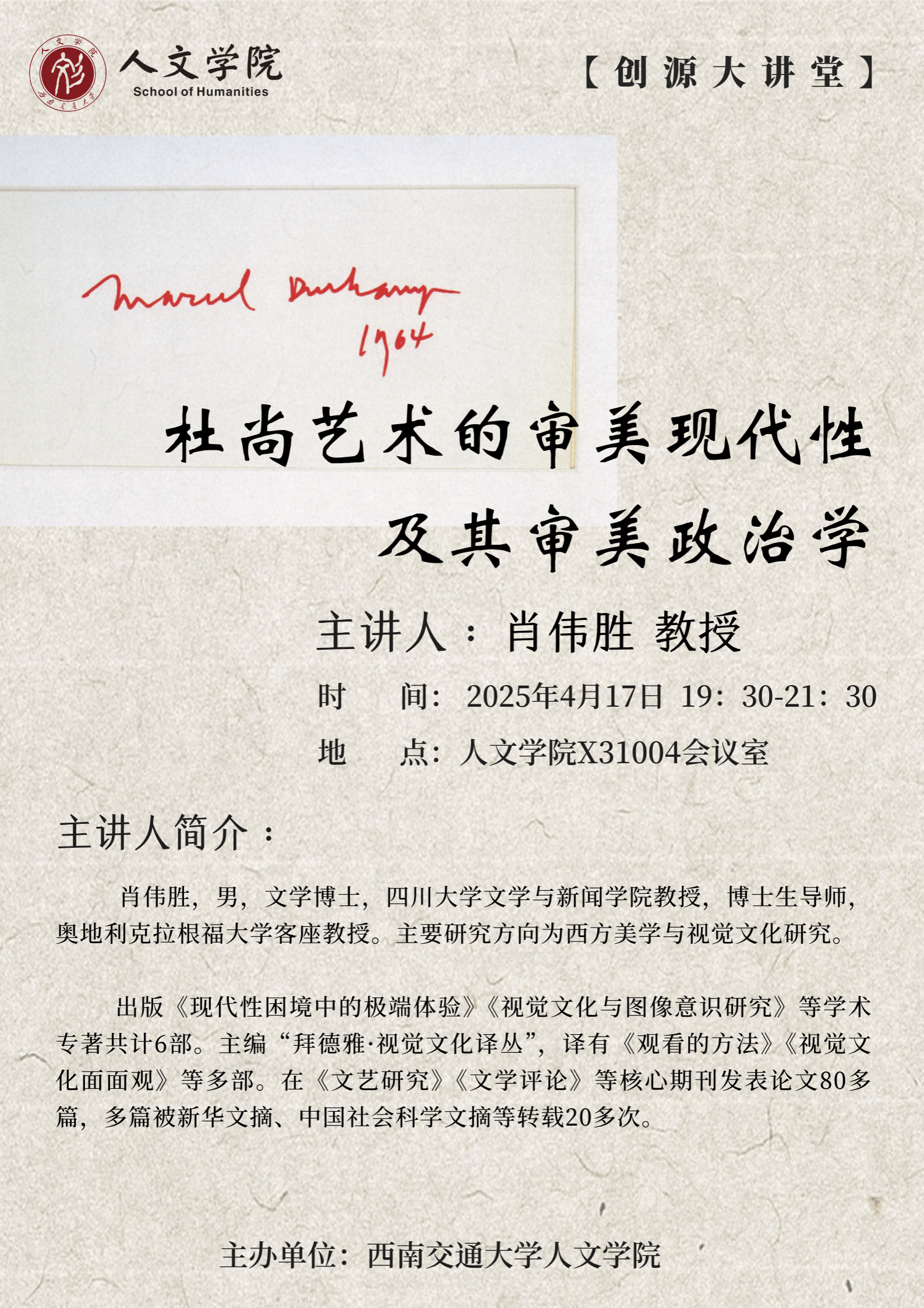 主讲人介绍:肖伟胜(1970—),男,文学博士,四川大学文学与新闻学院教授,博士生导师,奥地利克拉根福大学客座教授。主要研究方向为西方美学与视觉文化研究。出版《现代性困境中的极端体验》《视觉文化与图像意识研究》《“文化转向”与视觉文化研究》等学术专著共计6部。主编“拜德雅·视觉文化译丛”一套(共计40本),译有《观看的方法》《视觉文化面面观》等多部。在《文艺研究》《文学评论》《二十一世纪》(香港)等核心期刊发表论文80多篇,多篇被新华文摘、中国社会科学文摘、人大复印资料等转载20多次。