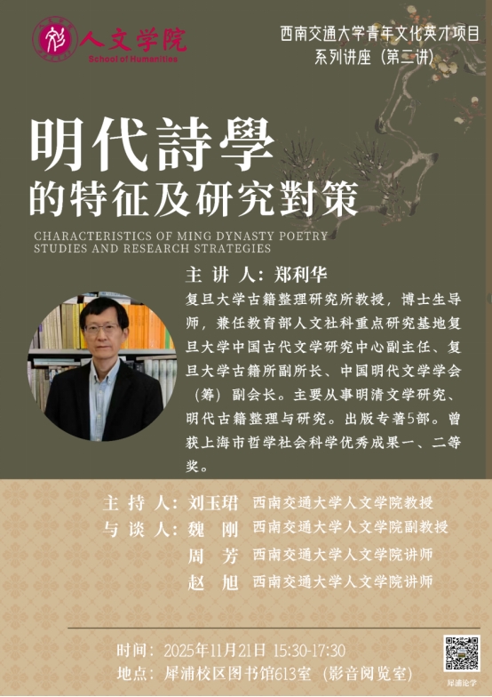 主讲人介绍:郑利华,复旦大学古籍整理研究所教授,博士生导师,兼任教育部人文社科重点研究基地复旦大学中国古代文学研究中心副主任、复旦大学古籍所副所长、中国明代文学学会(筹)副会长。主要从事明清文学研究、明代古籍整理与研究。先后主持教育部人文社科重点研究基地重大项目“明代诗学思想史”、2021—2035年国家古籍工作规划重点出版项目“明人别集丛编”等重大课题,著有《前后七子研究》《明代诗学思想史》《明代中期文学演进与城市形态》《王世贞年谱》《王世贞研究》等,主编《明人别集丛编》《王世贞全集》(合作)。曾获上海市哲学社会科学优秀成果著作一、二等奖等奖项。