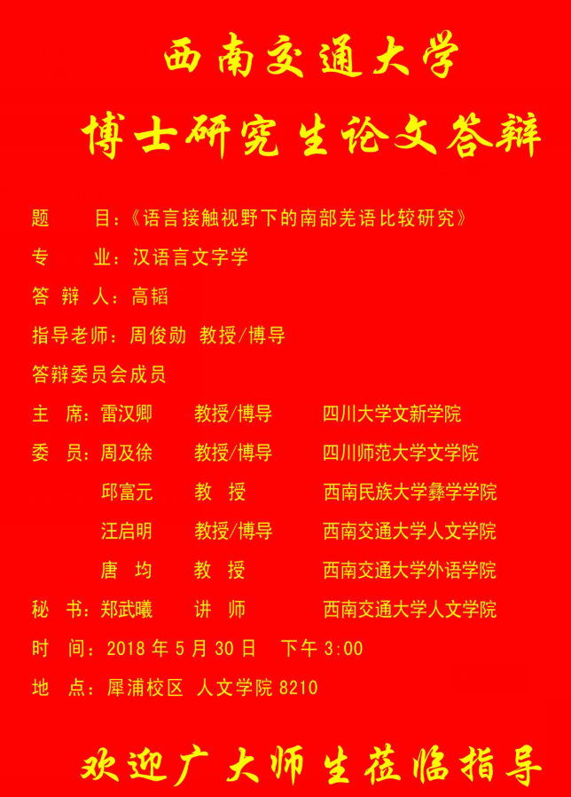 [通知]tyc8722太阳集团城博士研究生答辩公告
